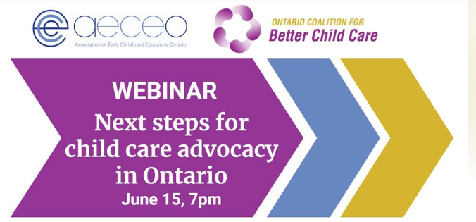 We have been asked to share with you an invitation from the Ontario Coalition for Better Child Care and the Association of Early Childhood Educators Ontario to their event NEXT STEPS FOR CHILD CARE ADVOCACY IN ONTARIO. The event is free and will be held online June 15 at 7 pm. Please click on the button below for joining instructions.