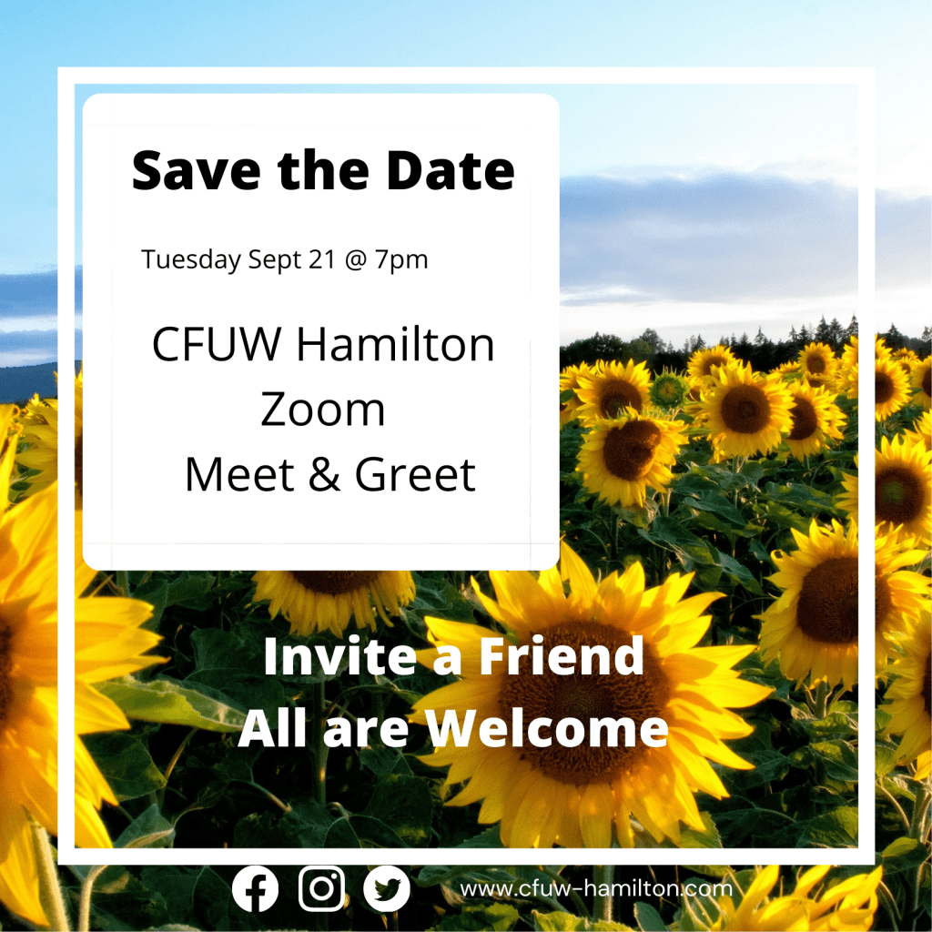 Enjoy a social evening with us via Zoom. Meet our new and returning members, connect with friends and learn about our interest groups and scholarship program. https://cfuw-hamilton.com/event-registration-form/