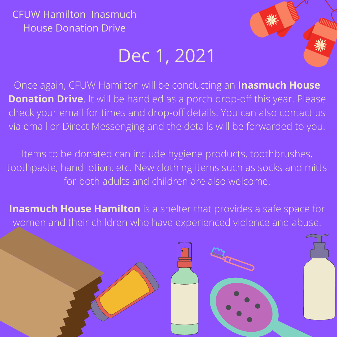 CFUW Hamilton Inasmuch House Donation Drive Dec 1, 2021