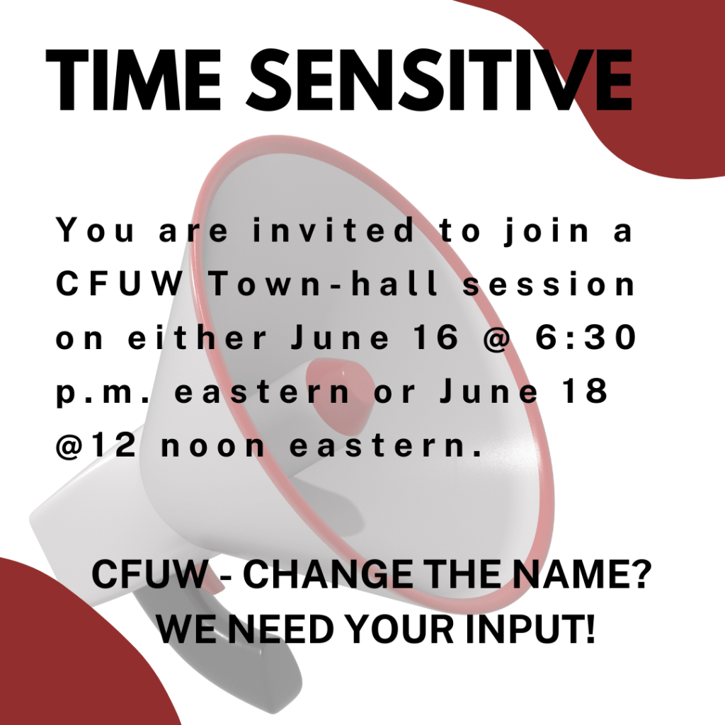 CFUW-Change the Name? Posted byInfoJune 10, 2022Posted inUncategorized For details and registration information see the CFUW Club Action Newsletter Special Edition June 8, 2022 . Share this: Click to share on Facebook (Opens in new window) Facebook Click to share on X (Opens in new window) X Click to share on Pinterest (Opens in new window) Pinterest Click to email a link to a friend (Opens in new window) Email Click to share on LinkedIn (Opens in new window) LinkedIn Click to print (Opens in new window) Print Like Loading... Related