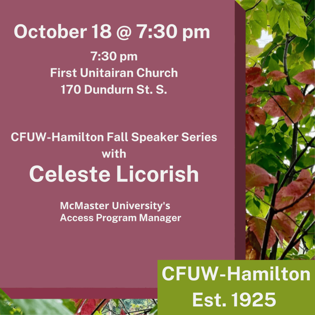 October Meeting Posted byInfoOctober 11, 2022Posted inUncategorizedTags:advocacy Our guest speaker will be Celeste Licorish, McMaster University’s Access Program Manager. Join us Tuesday Oct 18 7:30 pm First Unitarian Church, 170 Dundurn St S. Hamilton ON. Share this: Click to share on Facebook (Opens in new window) Facebook Click to share on X (Opens in new window) X Click to share on Pinterest (Opens in new window) Pinterest Click to email a link to a friend (Opens in new window) Email Click to share on LinkedIn (Opens in new window) LinkedIn Click to print (Opens in new window) Print Like Loading... Related