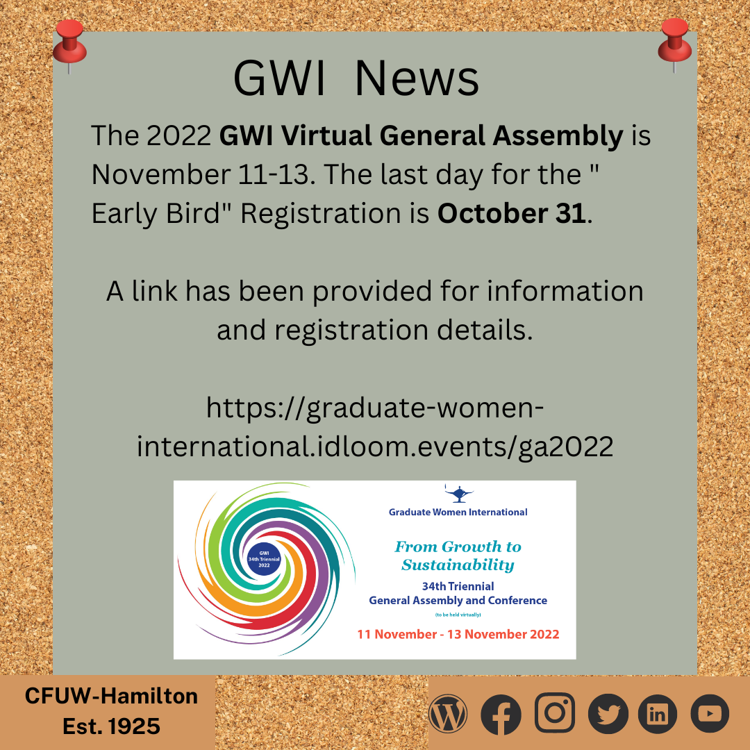 GWI Virtual General Assembly Posted byInfoOctober 27, 2022Posted inUncategorized Event Information and Registration Details https://graduate-women-international.idloom.events/ga2022 Share this: Click to share on Facebook (Opens in new window) Facebook Click to share on X (Opens in new window) X Click to share on Pinterest (Opens in new window) Pinterest Click to email a link to a friend (Opens in new window) Email Click to share on LinkedIn (Opens in new window) LinkedIn Click to print (Opens in new window) Print Like Loading... Related