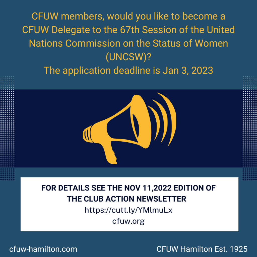 CFUW and the UNCSW Posted byInfoNovember 14, 2022Posted inUncategorized Read the Nov., 11/22 CFUW Club Action Newsletter here 👉 https://cutt.ly/YMlmuLx Share this: Click to share on Facebook (Opens in new window) Facebook Click to share on X (Opens in new window) X Click to share on Pinterest (Opens in new window) Pinterest Click to email a link to a friend (Opens in new window) Email Click to share on LinkedIn (Opens in new window) LinkedIn Click to print (Opens in new window) Print Like Loading... Related