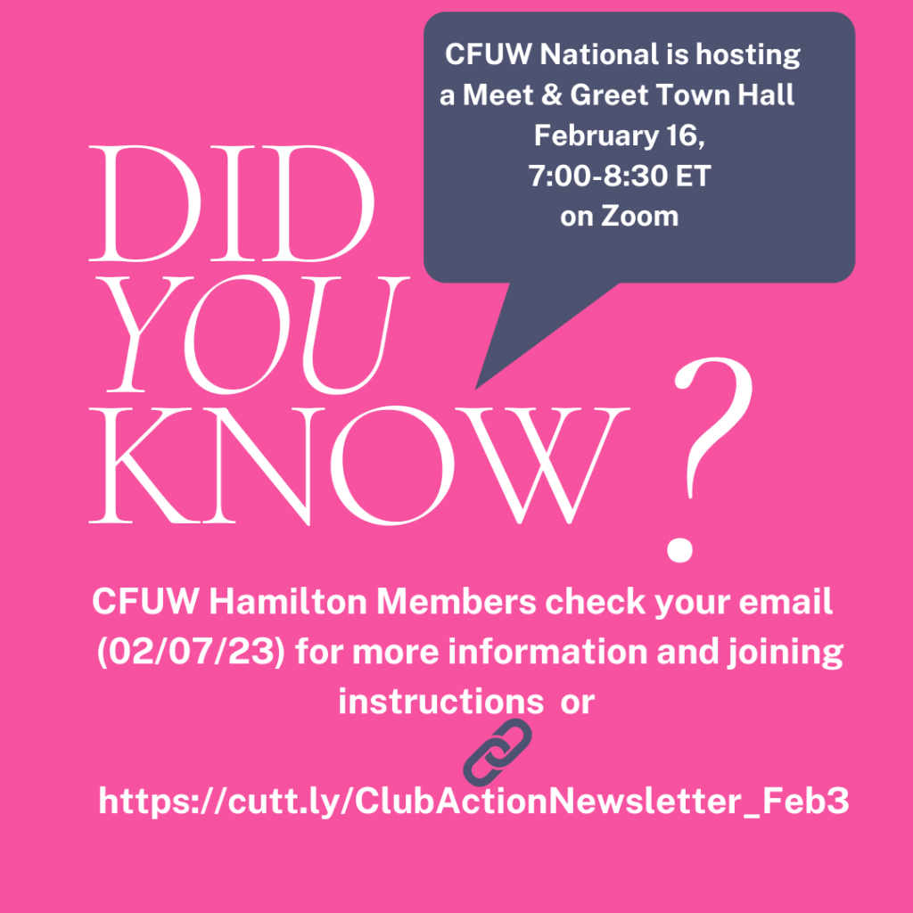 CFUW National – Meet & Greet Town Hall Feb 16 on Zoom Posted byInfoFebruary 8, 2023February 7, 2023Posted inUncategorized CFUW National is hosting a Meet & Greet Town Hall on February 16, 7:00-8:30 ET on Zoom for more information or to register ๐Link ๐ https://cutt.ly/ClubActionNewsletter_Feb3 Share this: Click to share on Facebook (Opens in new window) Facebook Click to share on X (Opens in new window) X Click to share on Pinterest (Opens in new window) Pinterest Click to email a link to a friend (Opens in new window) Email Click to share on LinkedIn (Opens in new window) LinkedIn Click to print (Opens in new window) Print Like Loading... Related