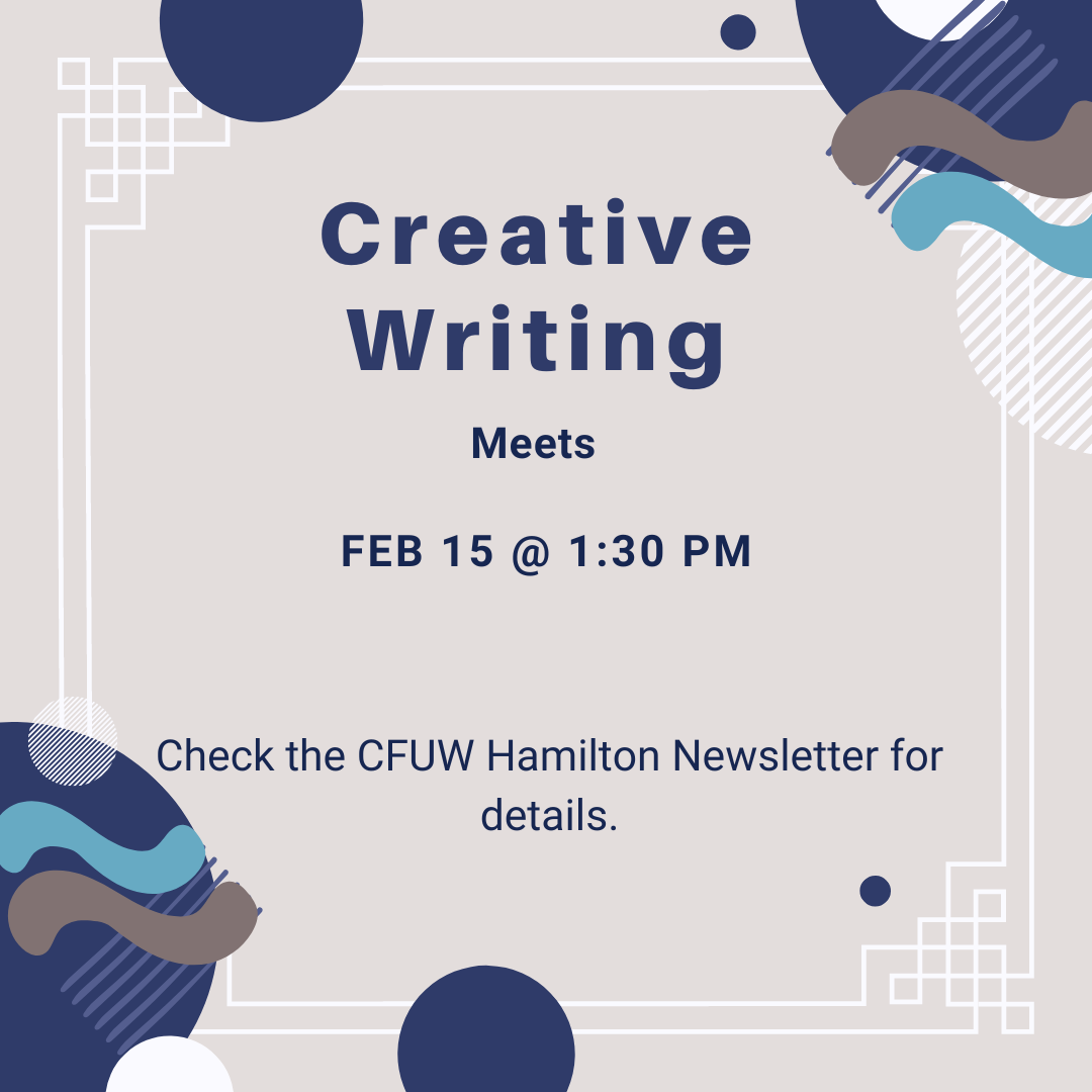 CFUW Hamilton – Creative Writing Posted byInfoFebruary 14, 2023February 13, 2023Posted inUncategorized CFUW-Hamilton – Get to Know UsAdvocacy – Education – Fellowship Share this: Click to share on Facebook (Opens in new window) Facebook Click to share on X (Opens in new window) X Click to share on Pinterest (Opens in new window) Pinterest Click to email a link to a friend (Opens in new window) Email Click to share on LinkedIn (Opens in new window) LinkedIn Click to print (Opens in new window) Print Like Loading... Related