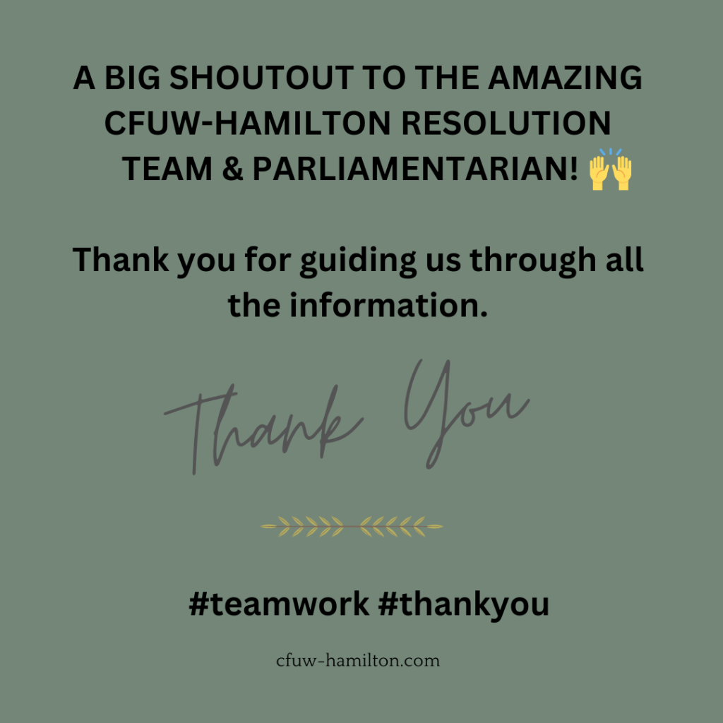 CFUW-Hamilton Resolution Team Posted byInfoMarch 22, 2023March 22, 2023Posted inUncategorized Thanks and kudos to the awesome CFUW Hamilton Resolution Team & our very knowledgeable parliamentarian! ππΌ π #teamwork #thankyou Share this: Click to share on Facebook (Opens in new window) Facebook Click to share on X (Opens in new window) X Click to share on Pinterest (Opens in new window) Pinterest Click to email a link to a friend (Opens in new window) Email Click to share on LinkedIn (Opens in new window) LinkedIn Click to print (Opens in new window) Print Like Loading... Related