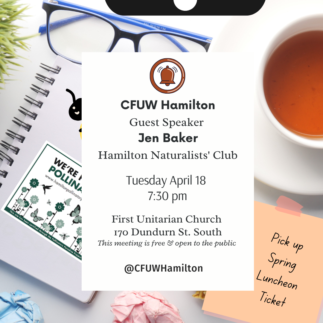 Hey there, nature lovers! 🌿🌼 Exciting news! Join CFUW Hamilton and Jen Baker from the Hamilton Naturalists’ Club Tuesday evening for an incredible discussion on Hamilton’s Pollinator Paradise Program! So grab a friend or two, and come on down.