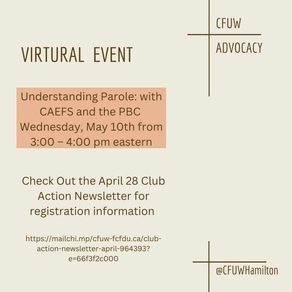 Join the Canadian Association of Elizabeth Fry Societies and the Parole Board of Canada on May 10th from 3-4 pm Eastern to learn about parole in Canada. Let’s understand the legal and social context, purpose, and functions of this system, and raise awareness about the impacts of pandemic conditions and failures of social systems that lead to criminalization. Check out the April 28 Club Action Newsletter for more details. https://mailchi.mp/cfuw-fcfdu.ca/club-action-newsletter-april-964393?e=66f3f2c000