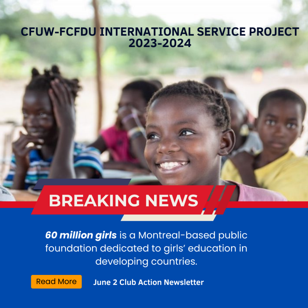 Find out more about our CFUW-FCFDU International Service Project for 2023-2024, 60 million girls. Check out the June 2nd Club Action Newsletter. https://cutt.ly/XwwxUeE9