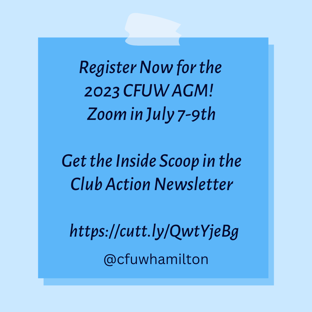Registration for the 2023 Virtual CFUW AGM is now open. Check out the latest edition of the Club Action Newsletter for details and registration information. https://cutt.ly/QwtYjeBg