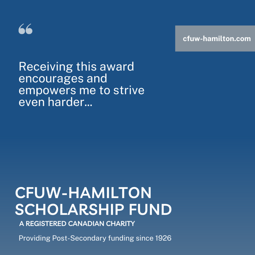A donation to the CFUW Hamilton Scholarship Fund is not just a financial contribution but a powerful statement of belief in the importance of education and the potential of women. https://www.canadahelps.org/en/charities/canadian-federation-of-university-women-hamilton-branch-scho/