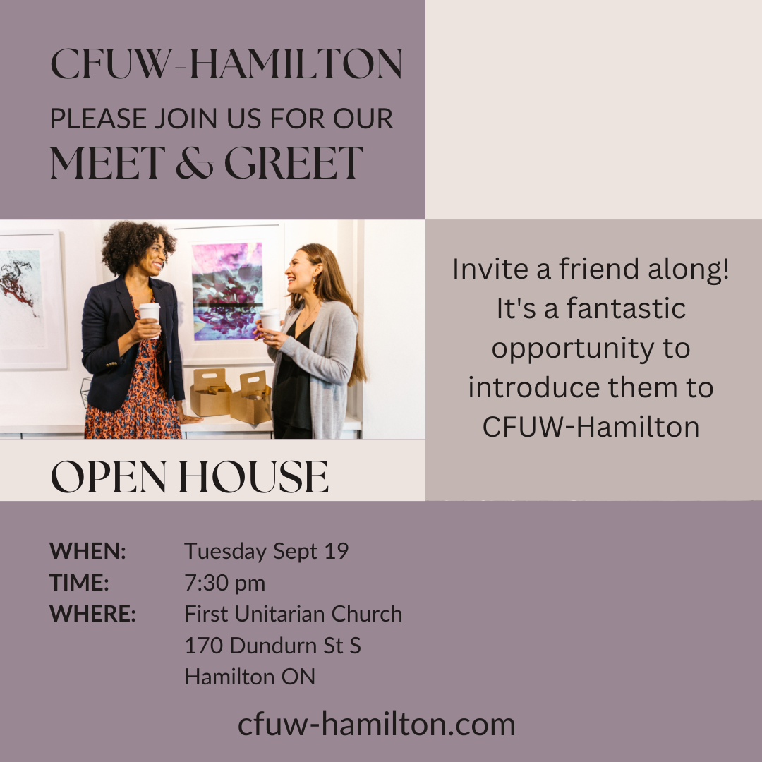 CFUW Hamilton Meet & Greet Open House Posted byInfoSeptember 8, 2023September 6, 2023Posted inUncategorized Stop by and join us for the CFUW-Hamilton Meet & Greet Open House. #CFUWHamilton #InterestGroups #CommunityEngagement #Advocacy #Education #Fellowship #MakeADifference #LifelongFriendships Share this: Click to share on Facebook (Opens in new window) Facebook Click to share on X (Opens in new window) X Click to share on Pinterest (Opens in new window) Pinterest Click to email a link to a friend (Opens in new window) Email Click to share on LinkedIn (Opens in new window) LinkedIn Click to print (Opens in new window) Print Like Loading... Related