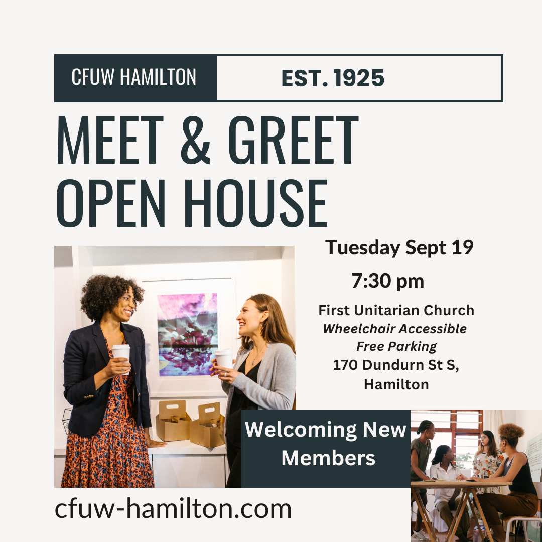CFUW Hamilton Welcoming New Members Posted byInfoSeptember 12, 2023September 11, 2023Posted inUncategorized Stop by and visit Sept 19 @ 7:30 pm First Unitarian Church, 170 Dundurn St S Hamilton. #EmpowerWomen #CFUWHamilton #NewMembersWelcome Share this: Click to share on Facebook (Opens in new window) Facebook Click to share on X (Opens in new window) X Click to share on Pinterest (Opens in new window) Pinterest Click to email a link to a friend (Opens in new window) Email Click to share on LinkedIn (Opens in new window) LinkedIn Click to print (Opens in new window) Print Like Loading... Related