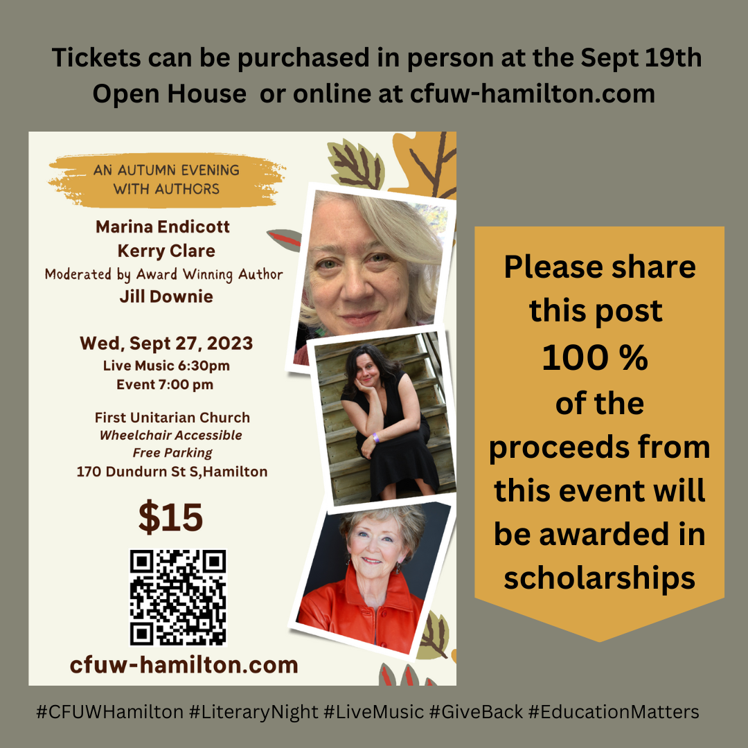Pick Up Your Author Night Tickets Tues. Sept 19th at our Open House Meet & Greet Posted byInfoSeptember 15, 2023September 13, 2023Posted inUncategorized Tickets for the event can be purchased in person ($15) at the Sept 19th CFUW Hamilton Open House, 7:30 pm, First Unitarian Church Hamilton, 170 Dundurn St S Hamilton ON. Stop by for a visit and pick up your ticket. See you Tuesday! Share this: Click to share on Facebook (Opens in new window) Facebook Click to share on X (Opens in new window) X Click to share on Pinterest (Opens in new window) Pinterest Click to email a link to a friend (Opens in new window) Email Click to share on LinkedIn (Opens in new window) LinkedIn Click to print (Opens in new window) Print Like Loading... Related