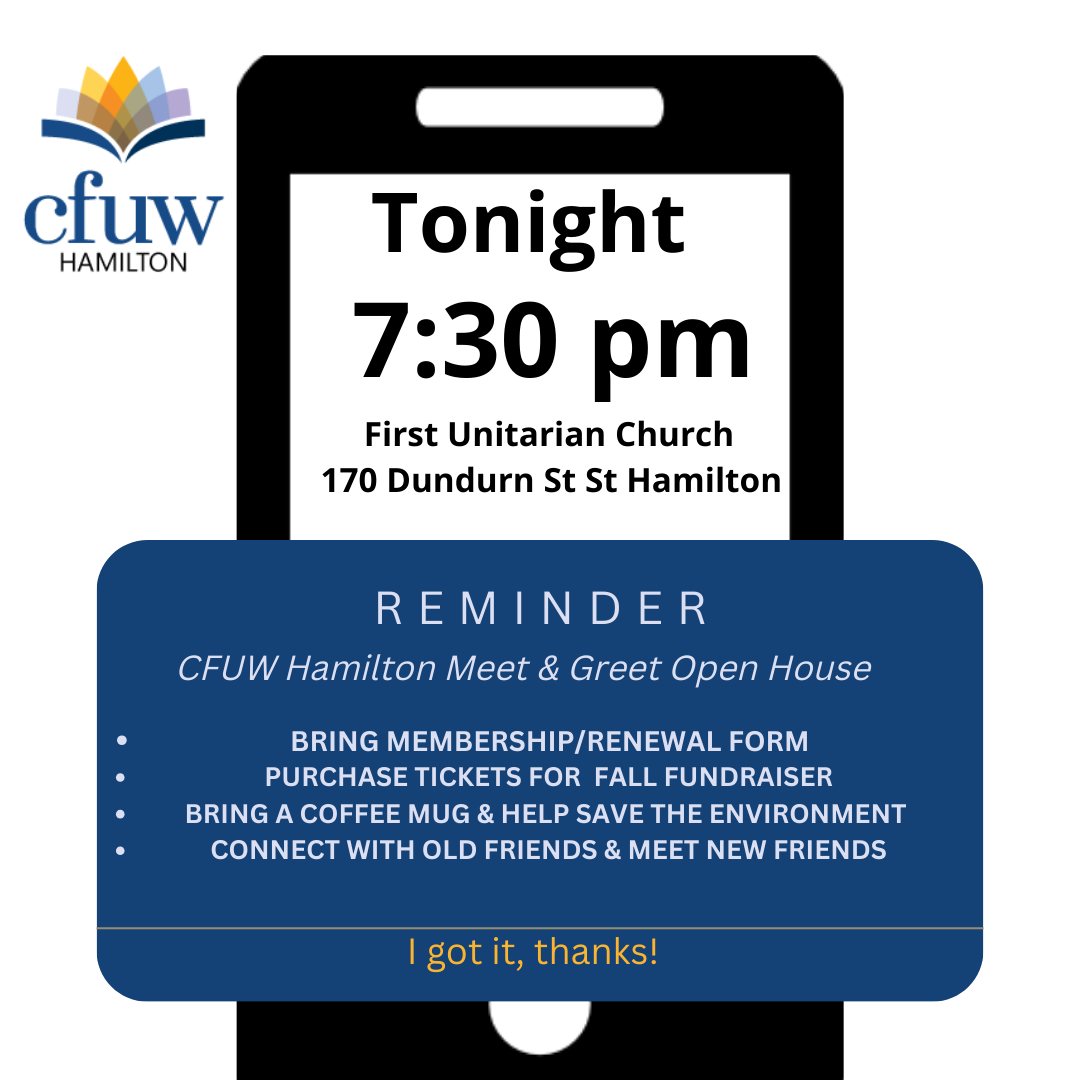 Join Us Tonight @ 7:30 pm Posted byInfoSeptember 19, 2023September 15, 2023Posted inUncategorized Join us tonight at 7:30 pm for CFUW Hamilton’s welcome event! #CFUWHamilton #NewMembersWelcome Share this: Click to share on Facebook (Opens in new window) Facebook Click to share on X (Opens in new window) X Click to share on Pinterest (Opens in new window) Pinterest Click to email a link to a friend (Opens in new window) Email Click to share on LinkedIn (Opens in new window) LinkedIn Click to print (Opens in new window) Print Like Loading... Related