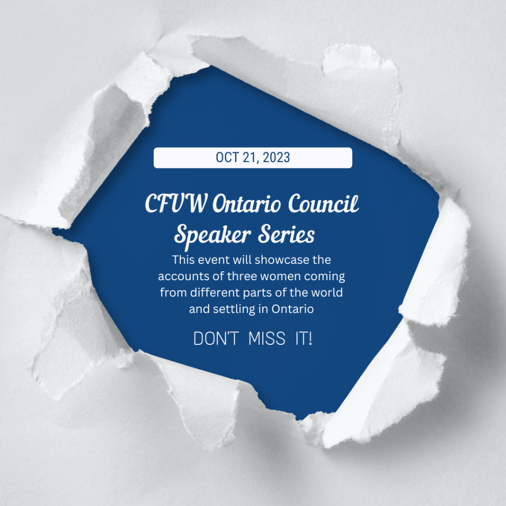 Women on the Move with CFUW Ontario Council – Oct 21st Posted byInfoOctober 6, 2023October 4, 2023Posted inUncategorized Registration is open for the Oct 21st Ontario Council Speaker Series – Women on the Move . For more details visit Events at cfuwontcouncil.org Share this: Click to share on Facebook (Opens in new window) Facebook Click to share on X (Opens in new window) X Click to share on Pinterest (Opens in new window) Pinterest Click to email a link to a friend (Opens in new window) Email Click to share on LinkedIn (Opens in new window) LinkedIn Click to print (Opens in new window) Print Like Loading... Related