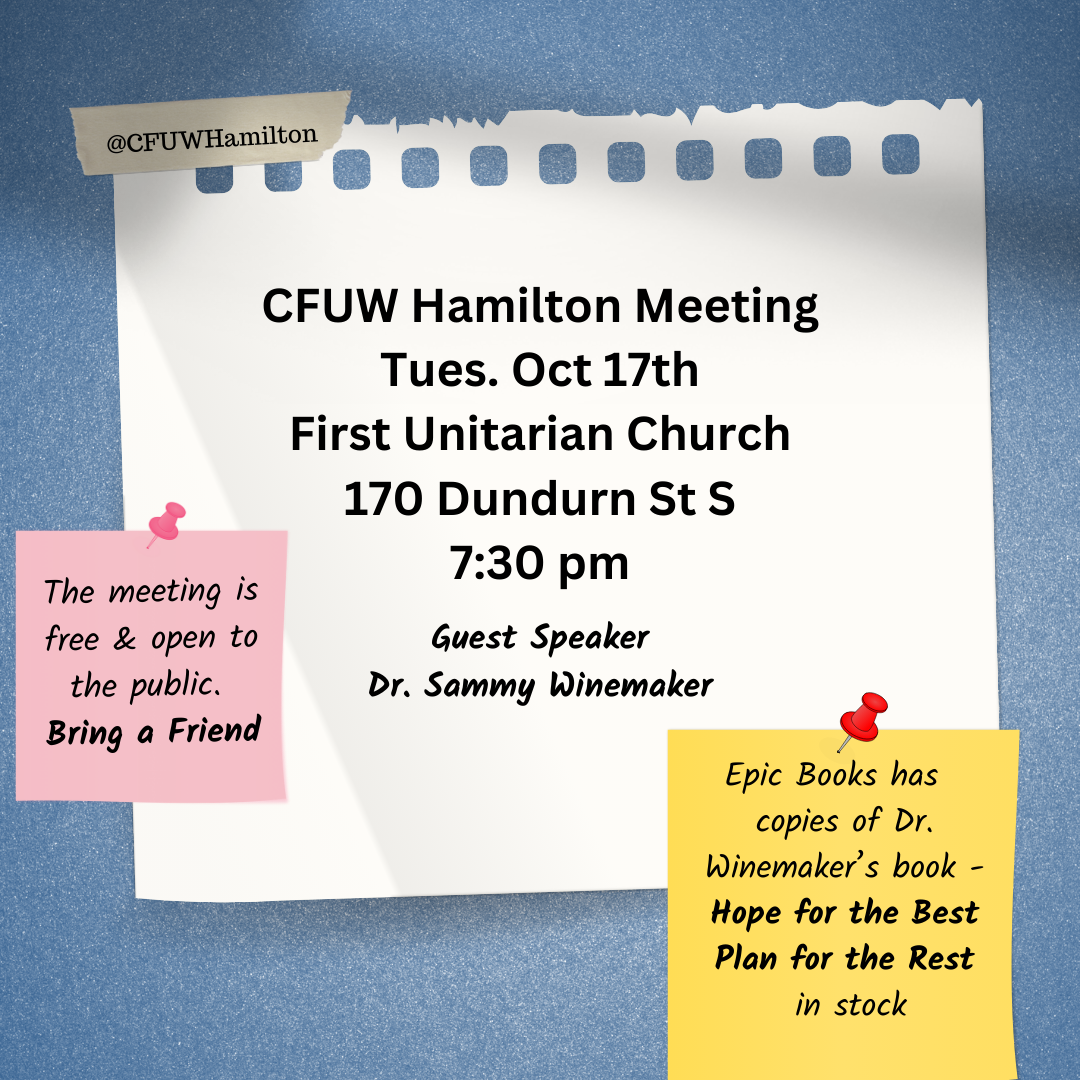 CFUW Hamilton October Speaker Series- Tues Oct 17th @7:30 pm Posted byInfoOctober 13, 2023October 9, 2023Posted inUncategorized October Speaker Series – Tuesday Oct 17th, 170 Dundurn St S 7:30 pm. Guest Speaker Dr. Sammy Winemaker – Hope for the Best Plan for the Rest. Epic Books has copies the book in stock. Share this: Share on Facebook (Opens in new window) Facebook Share on X (Opens in new window) X Share on Pinterest (Opens in new window) Pinterest Email a link to a friend (Opens in new window) Email Share on LinkedIn (Opens in new window) LinkedIn Print (Opens in new window) Print Like Loading... Related
