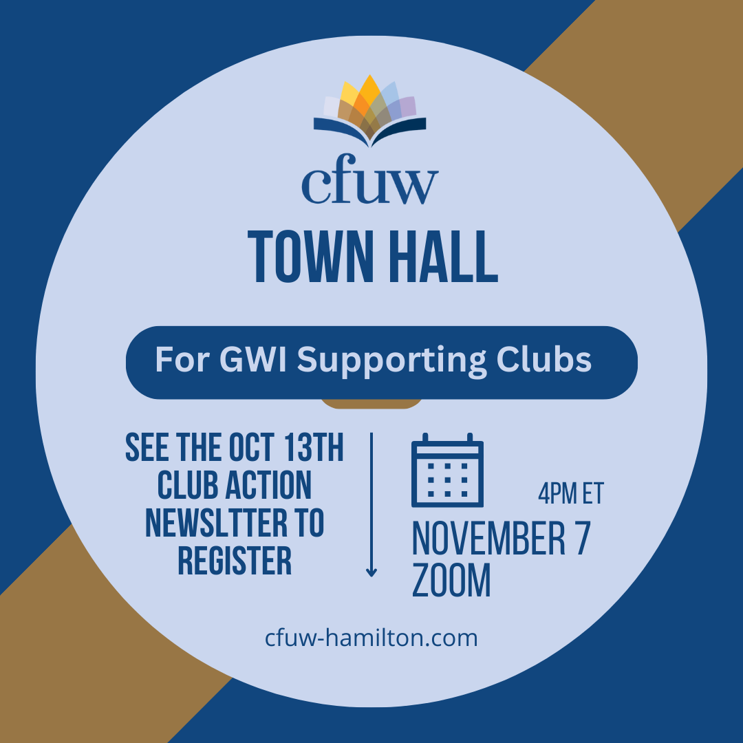 Nov 7th CFUW Town Hall for GWI Supporting Clubs Posted byInfoOctober 21, 2023October 17, 2023Posted inUncategorized CFUW Town Hall for GWI Supporting Clubs will be held Nov 7th on Zoom. See the Oct 13th Club Actions Newsletter to reserve your spot. https://cutt.ly/awQIvLNp #CFUW #GWI #TownHall Share this: Click to share on Facebook (Opens in new window) Facebook Click to share on X (Opens in new window) X Click to share on Pinterest (Opens in new window) Pinterest Click to email a link to a friend (Opens in new window) Email Click to share on LinkedIn (Opens in new window) LinkedIn Click to print (Opens in new window) Print Like Loading... Related