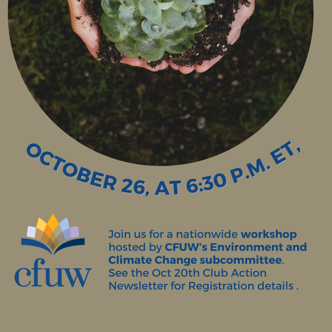 There is still time to Register. CFUW’s Environment and Climate Change Subcommittee is hosting a nationwide online workshop tomorrow Oct 26th, 6:30 pm ET.