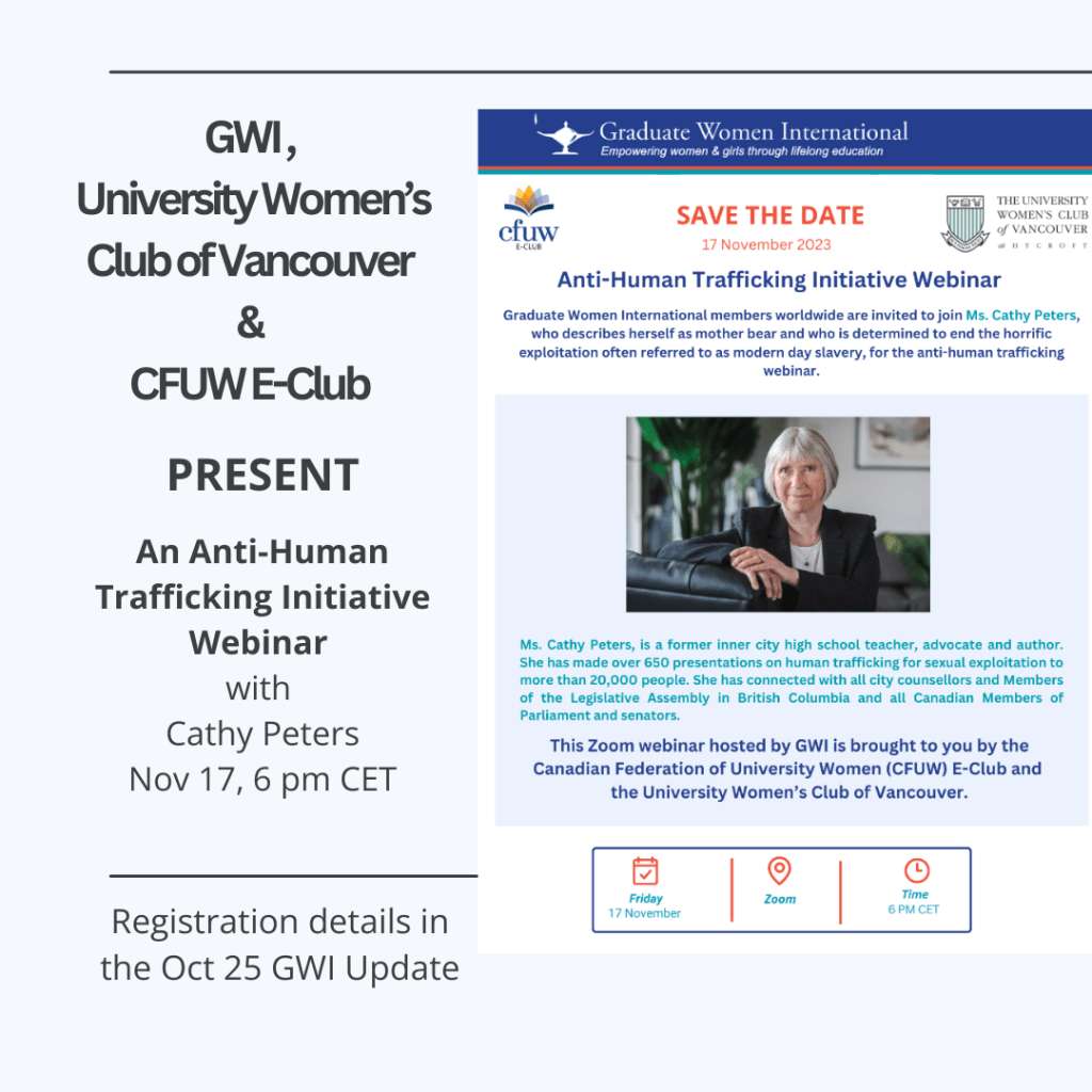 Join GWI for a crucial anti-human trafficking webinar with the University Women’s Club of Vancouver and CFUW E-Club. Check the Oct 25 GWI Update for details: https://cutt.ly/TwEQf1az