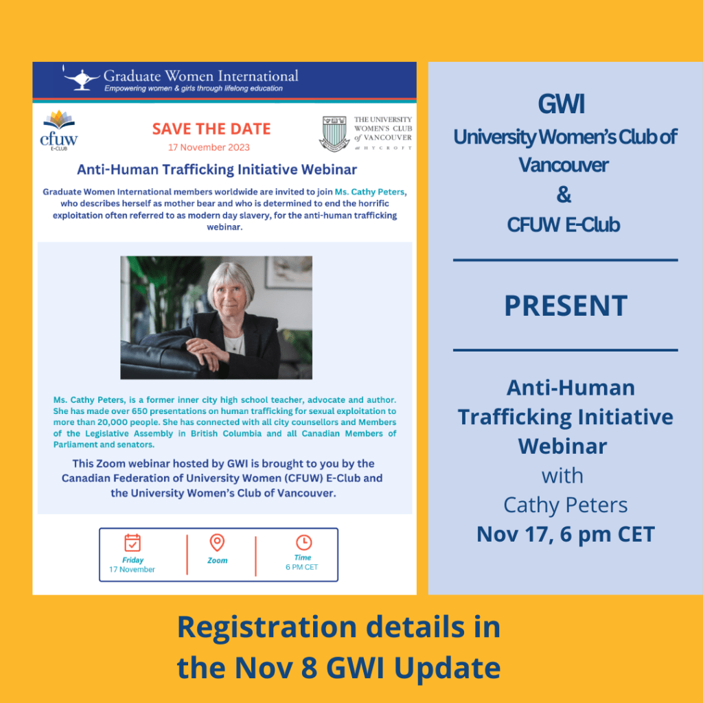 Your Invitation to the CFUW/GWI Worldwide Anti-Human Trafficking Initiative Webinar Posted byInfoNovember 10, 2023November 8, 2023Posted inUncategorized Join GWI, the University Women’s Club of Vancouver and the CFUW E-Club for an anti-human trafficking webinar. Check the NOV 8 GWI UPDATE for registration details. Share this: Click to share on Facebook (Opens in new window) Facebook Click to share on X (Opens in new window) X Click to share on Pinterest (Opens in new window) Pinterest Click to email a link to a friend (Opens in new window) Email Click to share on LinkedIn (Opens in new window) LinkedIn Click to print (Opens in new window) Print Like Loading... Related