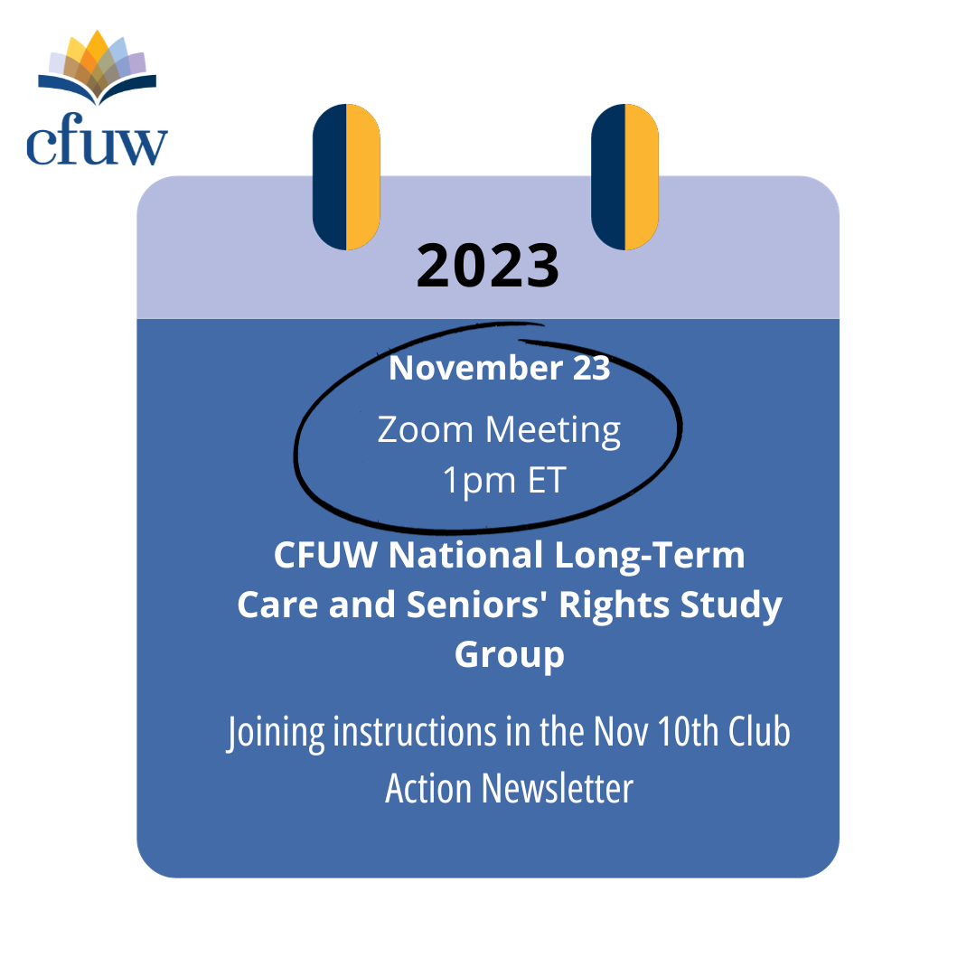 CFUW National Long-Term Care Senior’s Rights Study Group Posted byInfoNovember 14, 2023November 11, 2023Posted inUncategorized Join the CFUW Long Term Care Study Group Zoom Meeting on Nov 23, 1:00 PM ET. Registration details are in the Nov 10th Club Action Newsletter. Share this: Click to share on Facebook (Opens in new window) Facebook Click to share on X (Opens in new window) X Click to share on Pinterest (Opens in new window) Pinterest Click to email a link to a friend (Opens in new window) Email Click to share on LinkedIn (Opens in new window) LinkedIn Click to print (Opens in new window) Print Like Loading... Related