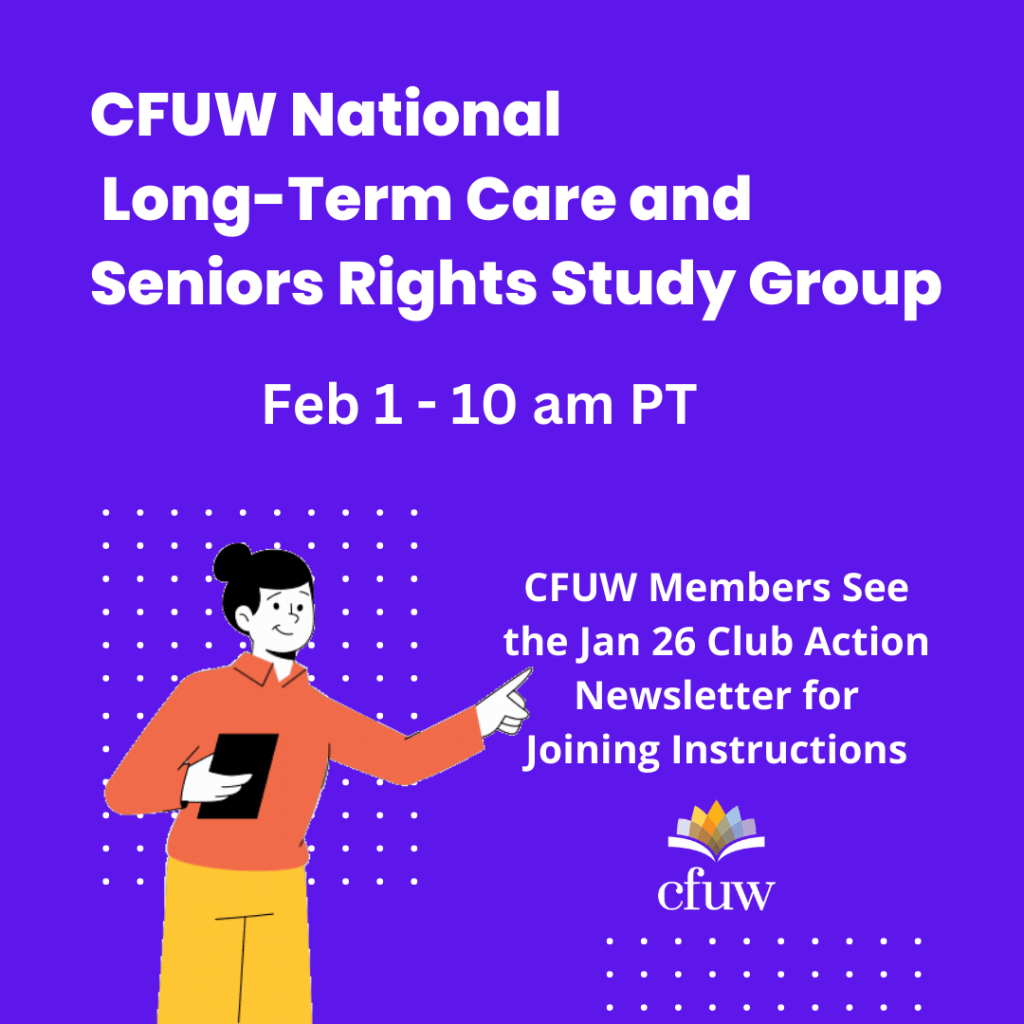 CFUW National Long-Term Care & Seniors Rights Study Group Posted byInfoJanuary 29, 2024January 28, 2024Posted inUncategorized CFUW National Long-Term Care and Seniors’ Rights Study Group. February 1, 10 AM PT. Reserve your spot today. https://cutt.ly/Jan26ClubAction Share this: Click to share on Facebook (Opens in new window) Facebook Click to share on X (Opens in new window) X Click to share on Pinterest (Opens in new window) Pinterest Click to email a link to a friend (Opens in new window) Email Click to share on LinkedIn (Opens in new window) LinkedIn Click to print (Opens in new window) Print Like Loading... Related