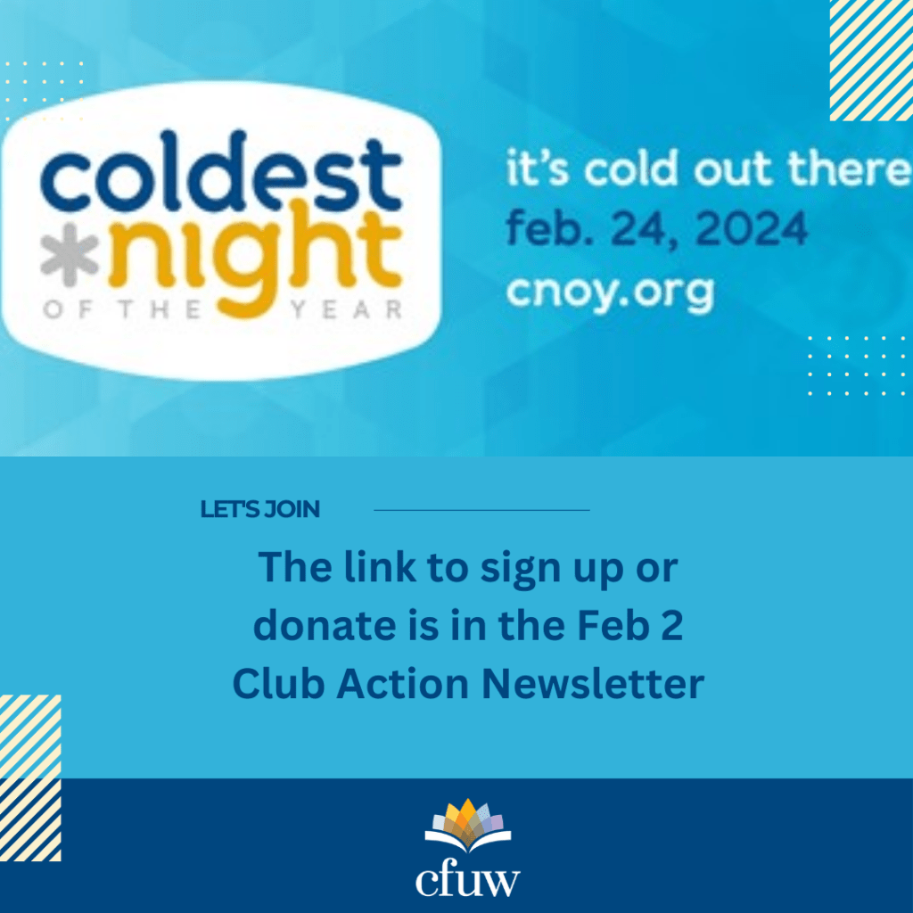 Join the winterrific cause! ❄️ Coldest Night of the Year: family-friendly walk supporting local charities. Team up, fundraise, and make a difference. 19 CFUW teams across Canada! See the Feb 2 Club Action Newsletter for details. #ColdestNight #CharityWalk
