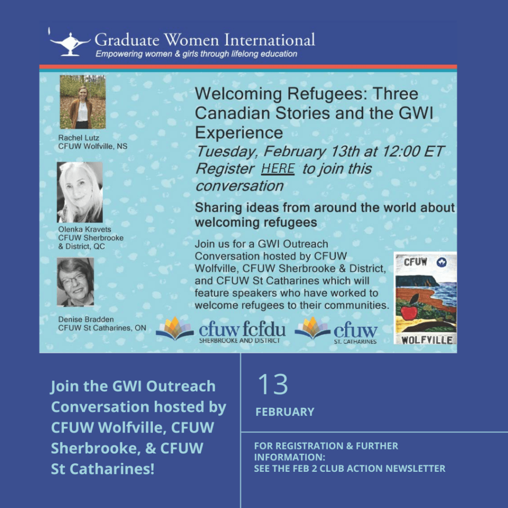 Join GWI Outreach Conversation hosted by CFUW Wolfville, CFUW St Sherbrooke, & CFUW St Catharines! 🌍🤝 #CommunityWelcoming #GWIOutreach