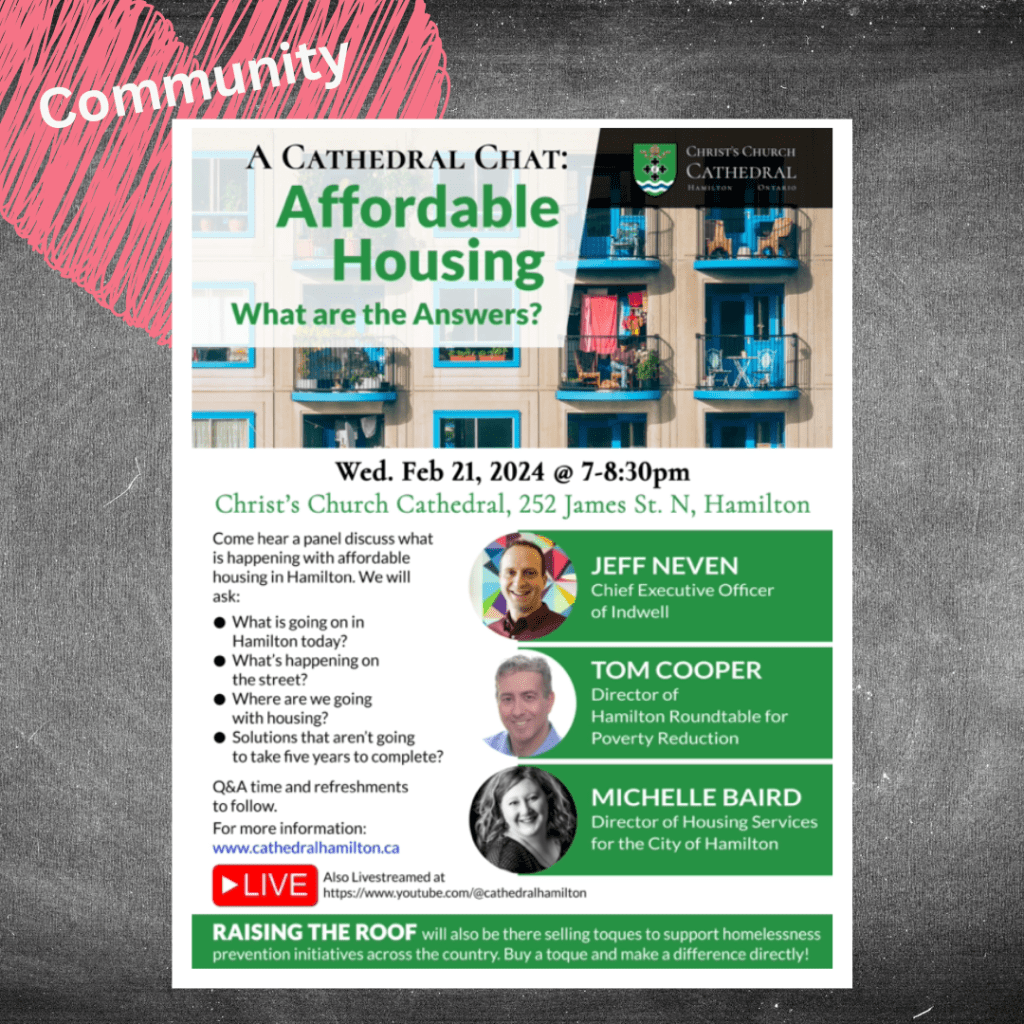 Affordable Housing- What are the Answers? Posted byInfoFebruary 11, 2024February 9, 2024Posted inUncategorized Expect a lively panel discussion on Feb 21, 7 pm at Christ’s Church Cathedral in Hamilton! Attend in person or via live stream. Don’t miss out! Details: https://cutt.ly/ywCR2FQR #CommunityEvent #InformativeSession Share this: Click to share on Facebook (Opens in new window) Facebook Click to share on X (Opens in new window) X Click to share on Pinterest (Opens in new window) Pinterest Click to email a link to a friend (Opens in new window) Email Click to share on LinkedIn (Opens in new window) LinkedIn Click to print (Opens in new window) Print Like Loading... Related