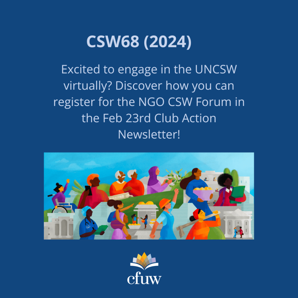 CSW69 (2024) Posted byInfoFebruary 28, 2024February 25, 2024Posted inUncategorized CSW68! CFUW sends 20 delegates to NYC but you can get involved virtually too! Register for the NGO CSW Forum and attend parallel events online. More information in the Feb 23rd edition of the Club Action Newsletter #CSW68 #VirtualInclusion Share this: Click to share on Facebook (Opens in new window) Facebook Click to share on X (Opens in new window) X Click to share on Pinterest (Opens in new window) Pinterest Click to email a link to a friend (Opens in new window) Email Click to share on LinkedIn (Opens in new window) LinkedIn Click to print (Opens in new window) Print Like Loading... Related