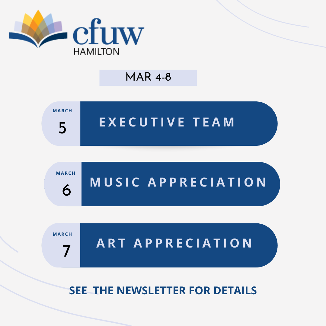 Enhance Your CFUW-Hamilton Experience Posted byInfoMarch 4, 2024March 2, 2024Posted inUncategorized Get ready for a dynamic week packed with enriching events and activities tailored to enhance your CFUW-Hamilton experience! From March 4th to 8th, 2024, we invite you to join us for a diverse lineup designed to inspire, engage, and connect. Share this: Share on Facebook (Opens in new window) Facebook Share on X (Opens in new window) X Share on Pinterest (Opens in new window) Pinterest Email a link to a friend (Opens in new window) Email Share on LinkedIn (Opens in new window) LinkedIn Print (Opens in new window) Print Like Loading... Related