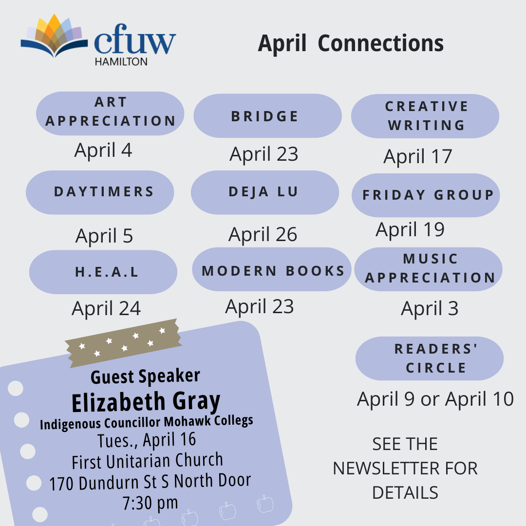 Stay informed and connected this April with CFUW-Hamilton! 🌸✨ #CFUWHamilton #AprilConnections #StayInformed #StayConnected