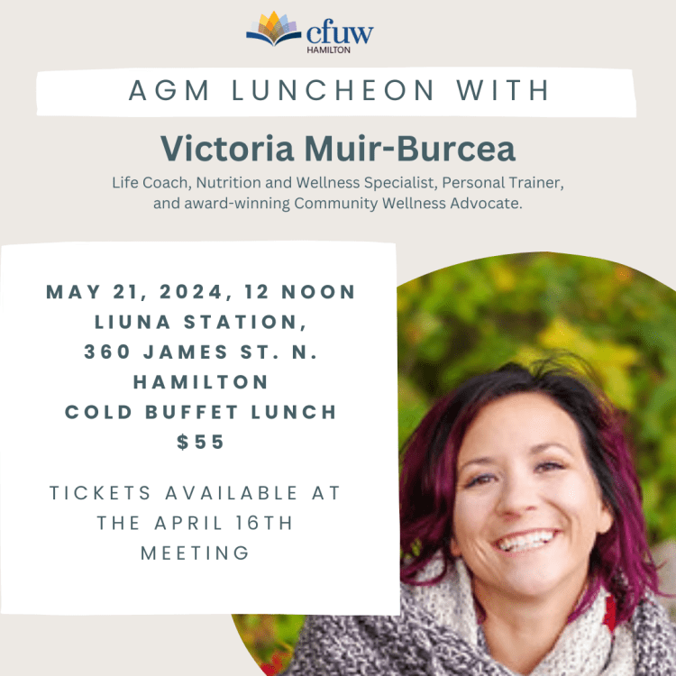 Tickets for the CFUW Hamilton AGM Luncheon will be available at the April 16th meeting. Our guest speaker Victoria Muir-Burcea Life Coach, Nutrition and Wellness Specialist, Personal Trainer and award-winning Community Wellness Advocate.