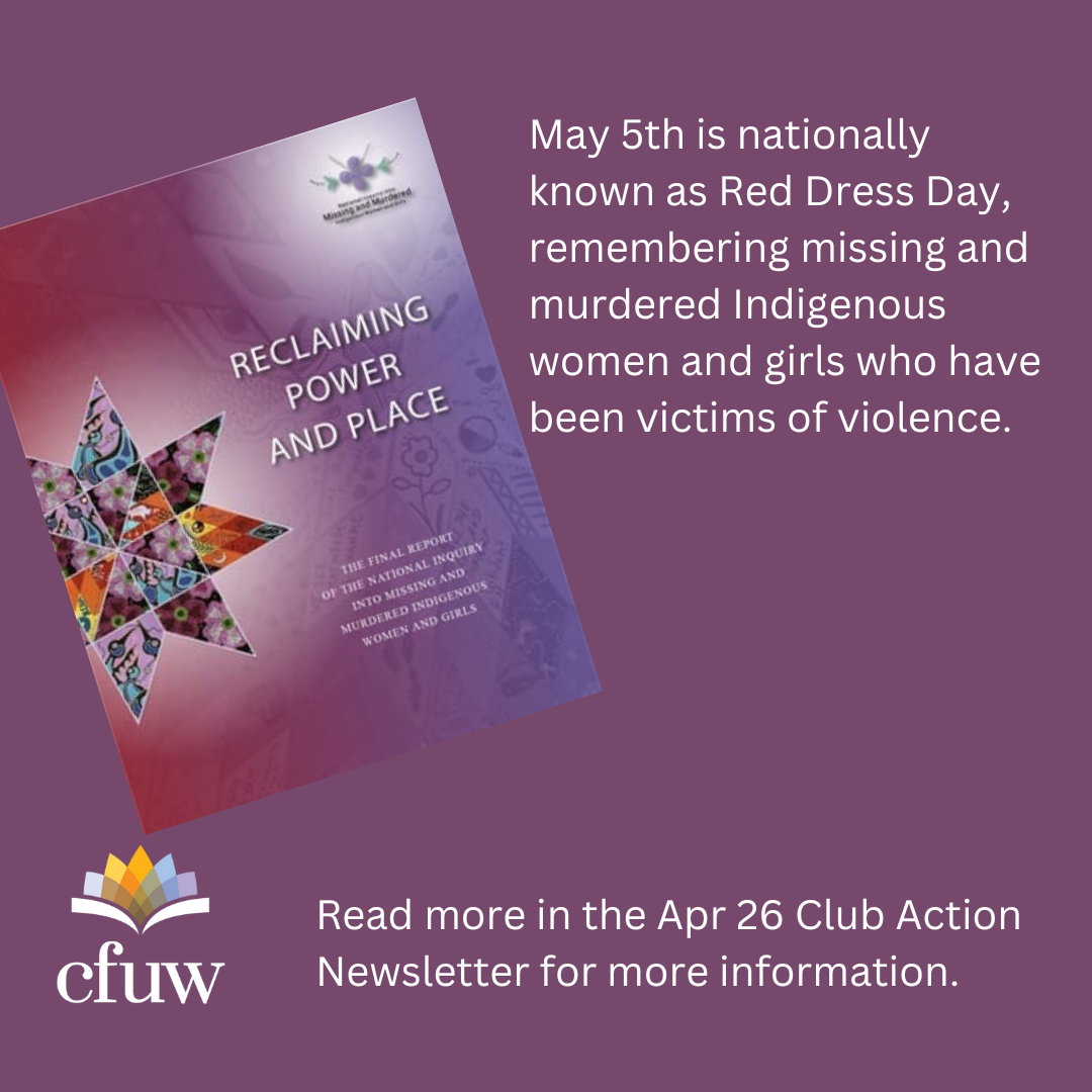 May 5th is nationally known as Red Dress Day, remembering missing and murdered Indigenous women and girls who have been victims of violence. Check out the Apr 26 Club Action Newsletter https://cutt.ly/4eqgkyeQ for more information.