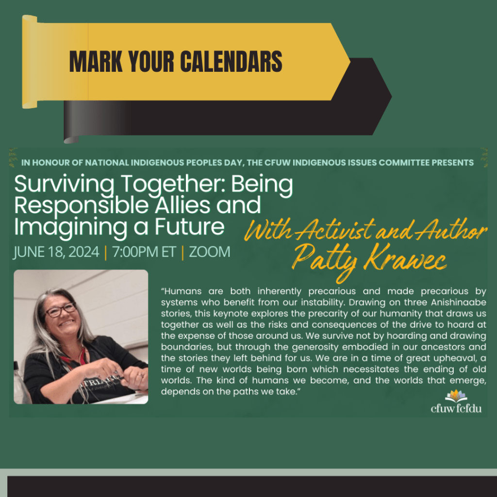 #MarkYourCalendars! 📅Join the CFUW Indigenous Issues Sub-Committee on Tuesday, June 18th at 7 pm ET for “Surviving Together—Being Responsible Allies and Imagining a Future” with author and activist Patty Krawec.For more details, see the May 24th Club Action Newsletter: https://cutt.ly/VeyfNNoL