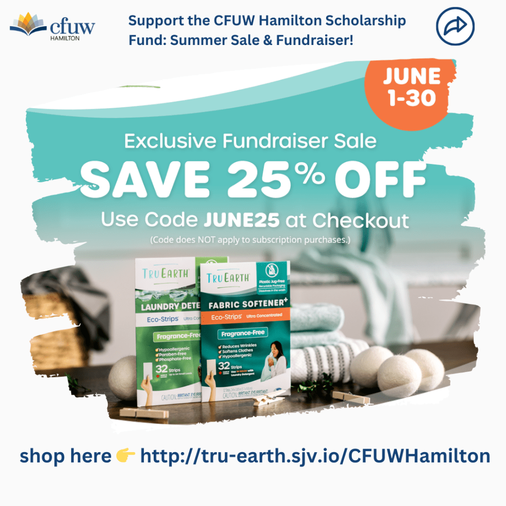 Celebrate summer with the CFUW Hamilton Scholarship Fund! Enjoy an exclusive 25% off your entire Tru Earth order throughout June. Plus, 20% of every sale supports our scholarship fund. Share our fundraising link and let’s make this summer a success!