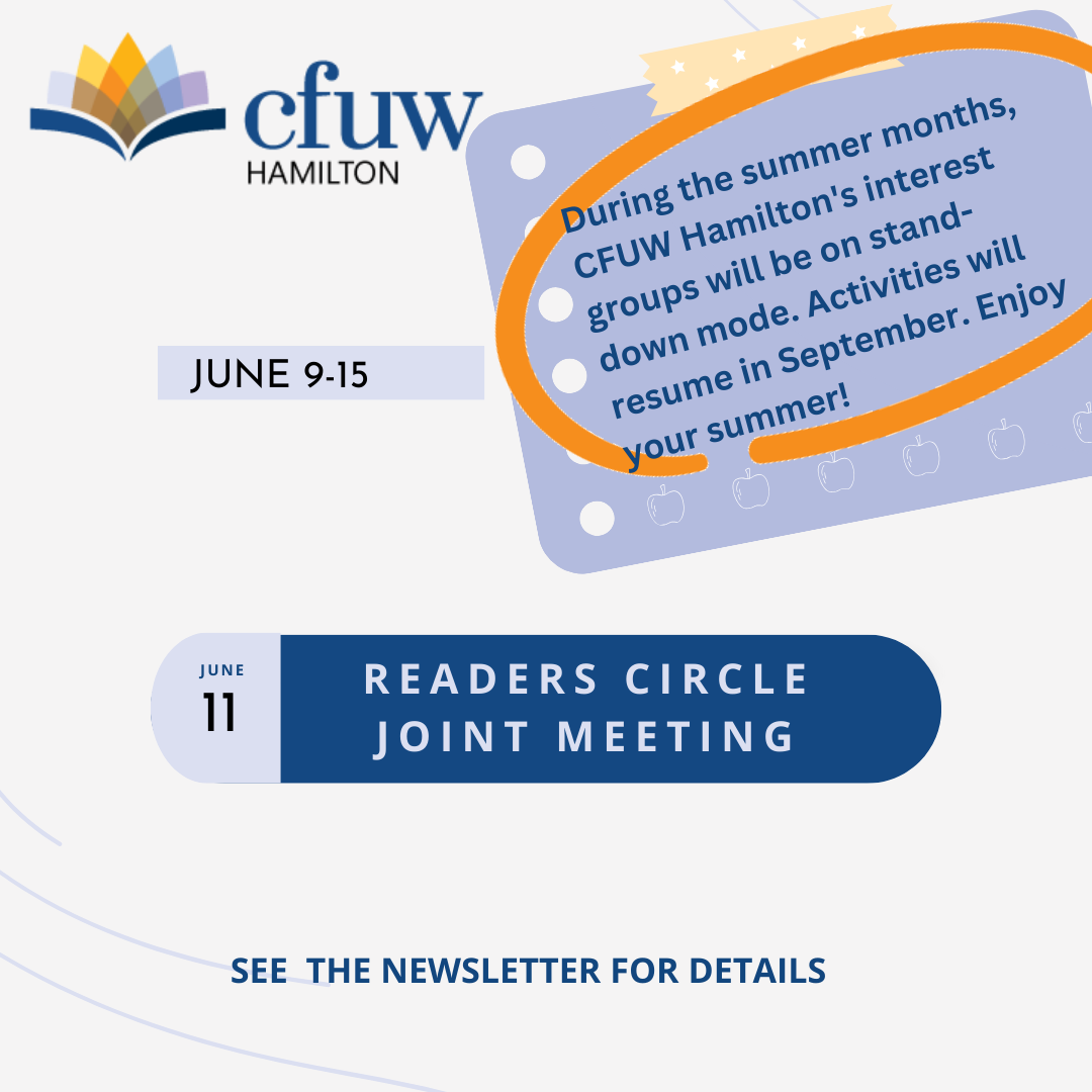 CFUW Hamilton Interest Groups June 9-15 Posted byInfoJune 9, 2024June 6, 2024Posted inUncategorized This week with CFUW Hamilton. 🌟 #CFUWHamilton100 #CenturyOfEmpowerment Share this: Click to share on Facebook (Opens in new window) Facebook Click to share on X (Opens in new window) X Click to share on Pinterest (Opens in new window) Pinterest Click to email a link to a friend (Opens in new window) Email Click to share on LinkedIn (Opens in new window) LinkedIn Click to print (Opens in new window) Print Like Loading... Related