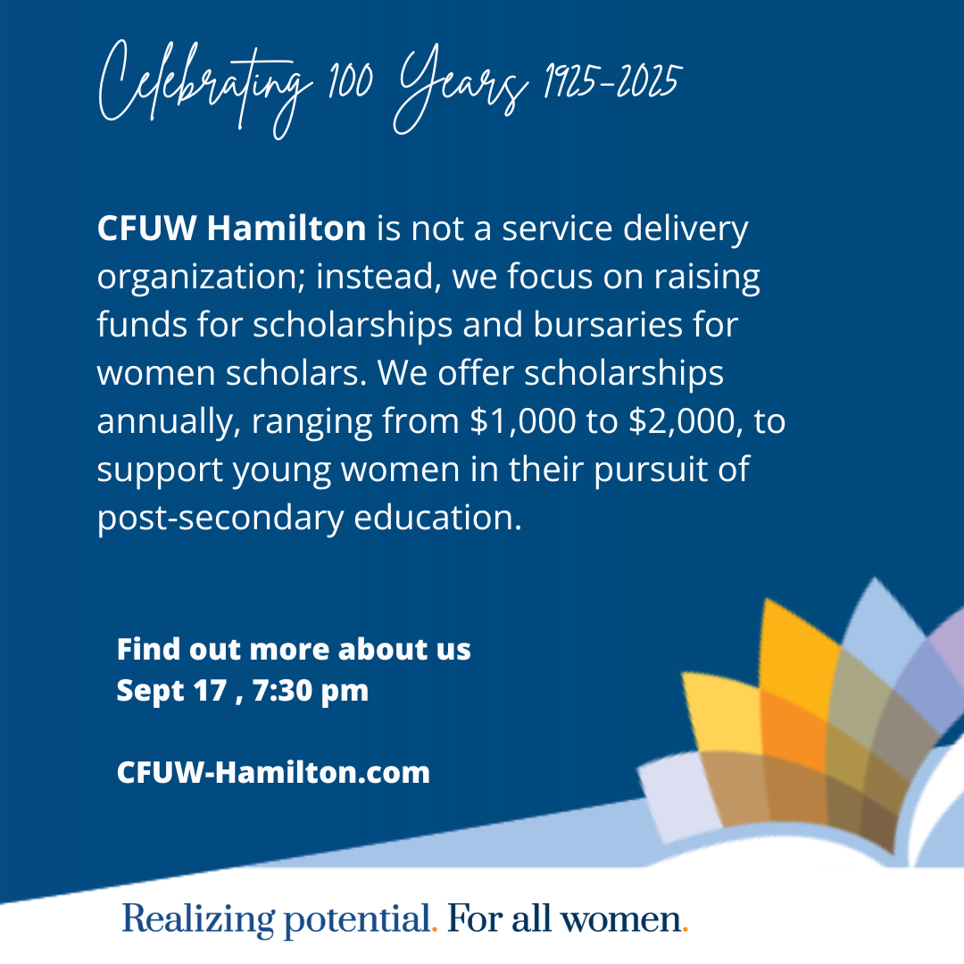 About CFUW Hamilton Posted byInfoAugust 23, 2024August 16, 2024Posted inUncategorized CFUW Hamilton funds scholarships and bursaries, empowering young women in their academic journeys. #cfuwhamilton100 Share this: Click to share on Facebook (Opens in new window) Facebook Click to share on X (Opens in new window) X Click to share on Pinterest (Opens in new window) Pinterest Click to email a link to a friend (Opens in new window) Email Click to share on LinkedIn (Opens in new window) LinkedIn Click to print (Opens in new window) Print Like Loading... Related