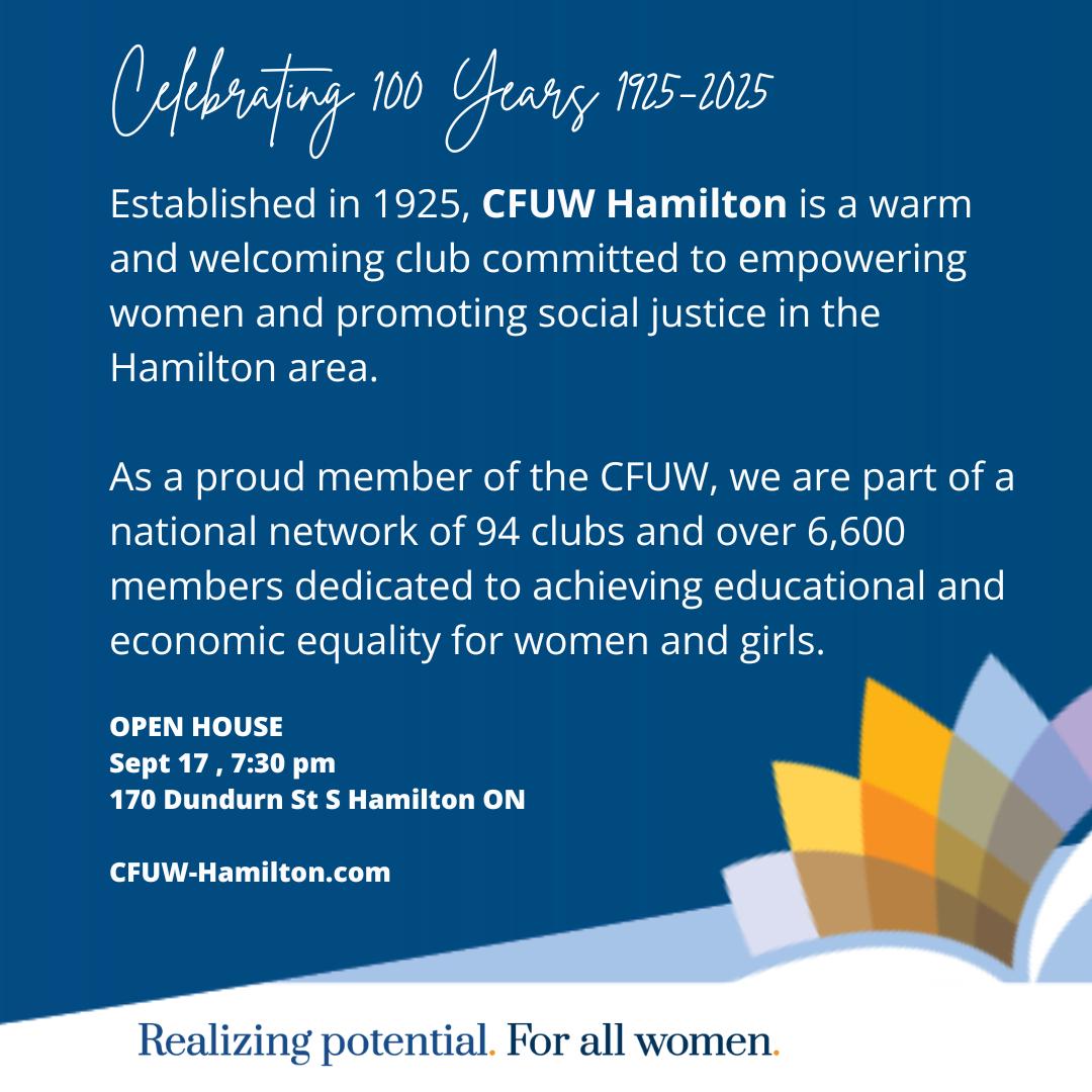 Join us on September 17th at 7:30 PM to learn more about our mission and how you can get involved. Be part of a proud national network dedicated to educational and economic equality for women and girls. #CFUWHamilton #WomenEmpoweringWomen #SocialJustice #CommunityMatters