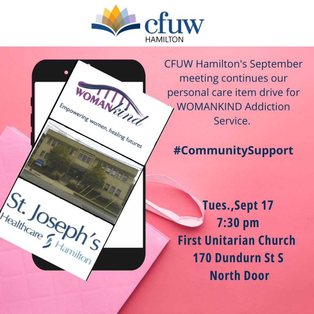🌟 Join us at the CFUW Hamilton September meeting as we continue our collection drive for personal care items supporting WOMANKIND Addiction Service. Let’s make a difference together by providing essential items to women in need in our community. Bring your donations and be part of this important initiative! 🌿💙 #CFUWHamilton #WOMANKIND #CommunitySupport #WomenHelpingWomen
