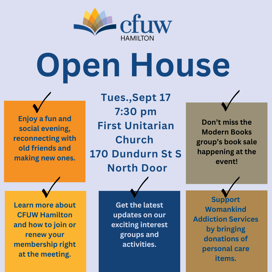 ✨ Just a few days to go! ✨Don’t forget to join us at CFUW Hamilton’s Meet and Greet this Tuesday, September 17th at 7:30 PM. It’s the perfect chance to reconnect with friends, meet new members, and hear about our exciting interest groups. Plus, bring personal care items to support Womankind Addiction Services, and browse the Modern Books group’s book sale! See you soon!”