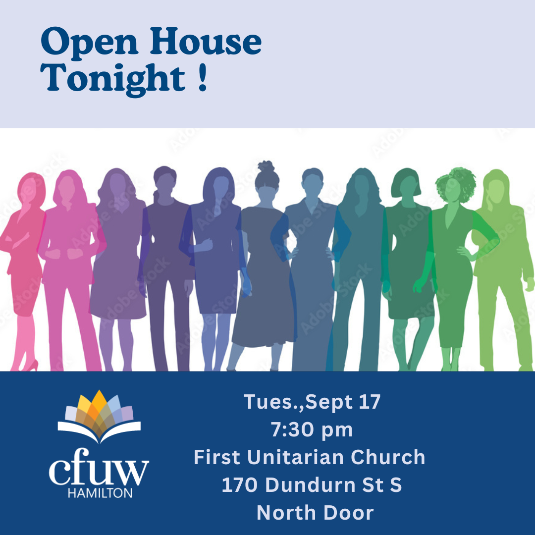 🌟 Tonight’s the night! 🌟Join us for a fun and social evening at CFUW Hamilton’s Open House! Catch up with old friends, make new connections, and get the latest updates on our interest groups.