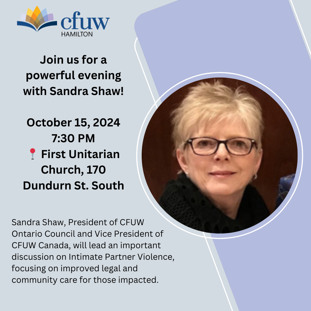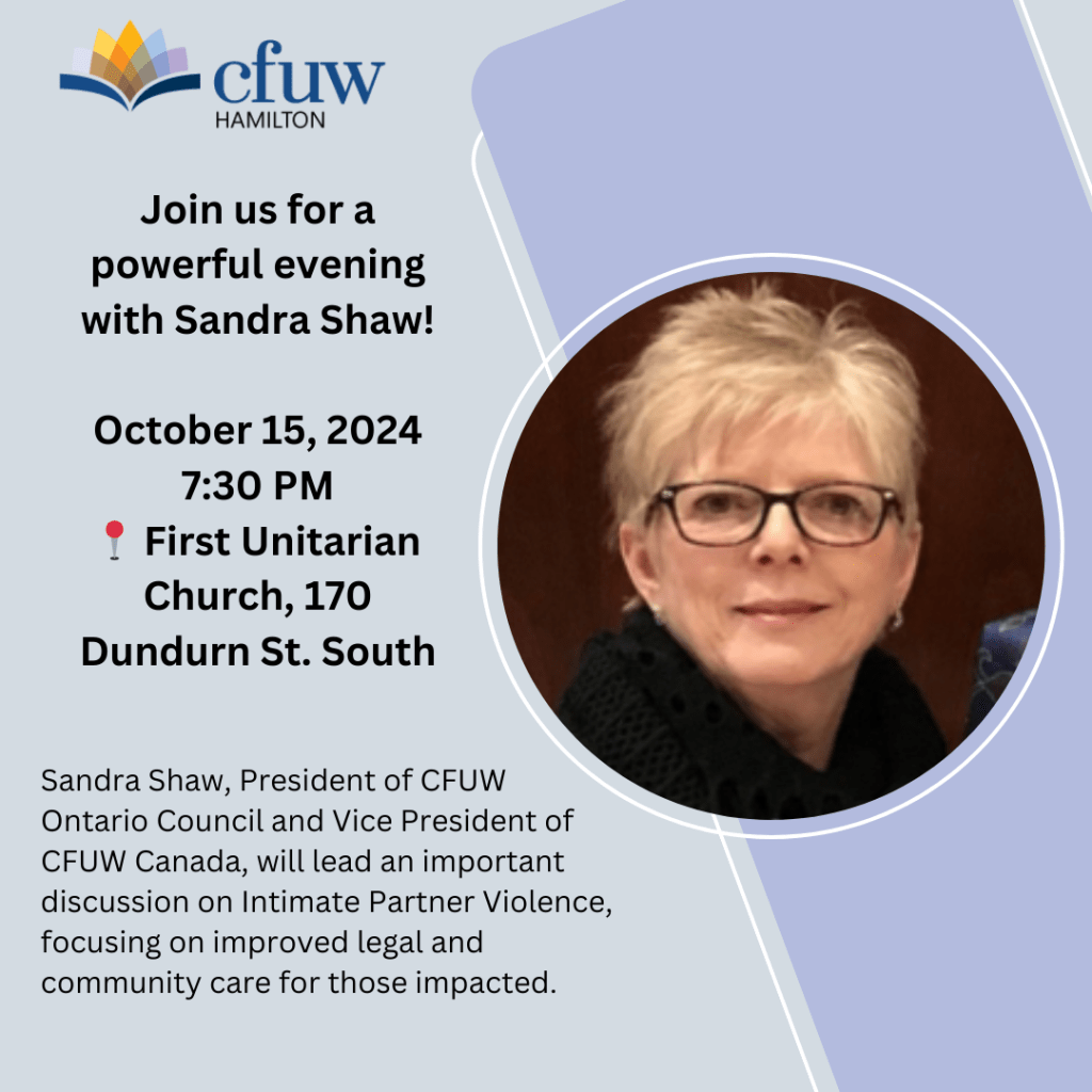 Join Sandra Shaw, CFUW Ontario Council President, as she speaks on Intimate Partner Violence and improved care for survivors. Donβt miss this important conversation!