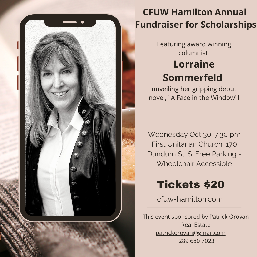 Save the date! π On October 30th, award-winning columnist Lorraine Sommerfeld will debut her novel A Face in the Window at our Scholarship Fundraiser. π