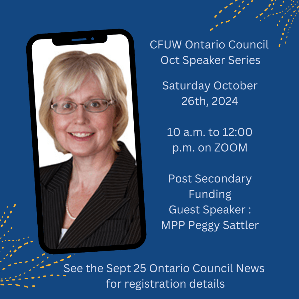 Registration is open for THE CFUW Ontario Council’s October Speaker Series. The topic is Post Secondary Funding with guest speaker MPP Peggy Sattler—registration details in the September edition of the CFUW Ontario Council News. https://cutt.ly/feIFKFR9