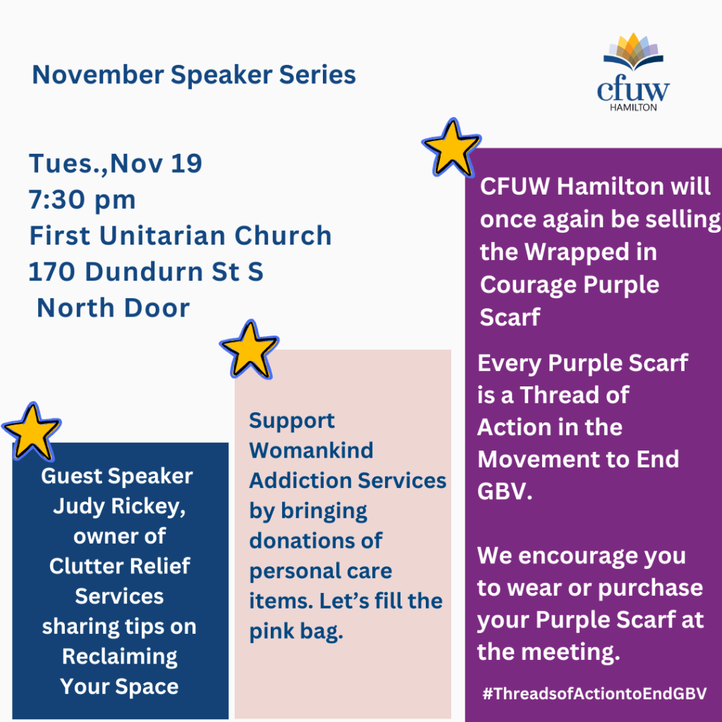 📅 Save the Date! -Tuesday, 7:30 PM at First Unitarian Church, 170 Dundurn St. S. Guest speaker Judy Rickey from Clutter Relief Services will share tips on “Reclaiming Your Space.” Plus, pick up a Wrapped in Purple scarf supporting Inasmuch House, and help us fill our pink bag with essentials for Womankind. See you there!Â