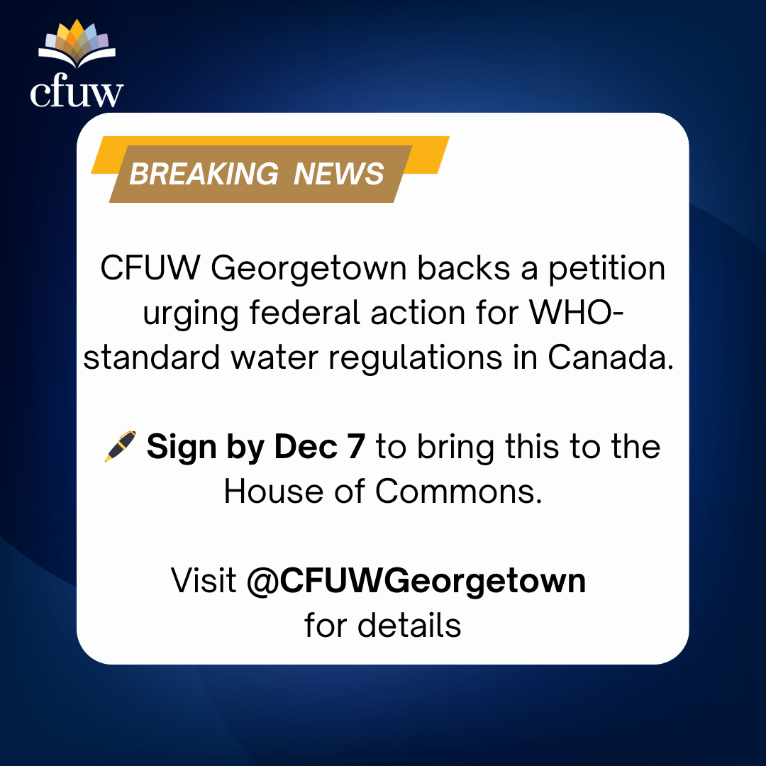 🖊️ Visit – @CFUWGeorgetown and sign the petition by December 7 to ensure it reaches the House of Commons for a response. Together, we can advocate for safe, regulated drinking water for all Canadians!