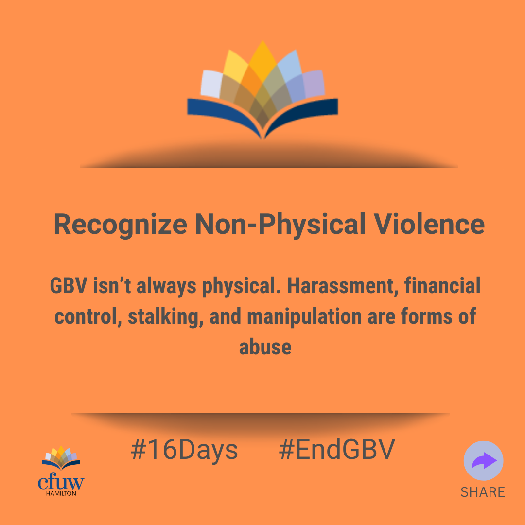Recognize Non-Physical Violence Posted byInfoNovember 28, 2024November 22, 2024Posted inUncategorized π GBV isnβt always physical. Harassment, financial control, stalking, and manipulation are forms of abuse.π Recognize. Name. Stop.#16Days #EndViolence Share this: Share on Facebook (Opens in new window) Facebook Share on X (Opens in new window) X Share on Pinterest (Opens in new window) Pinterest Email a link to a friend (Opens in new window) Email Share on LinkedIn (Opens in new window) LinkedIn Print (Opens in new window) Print Like Loading... Related