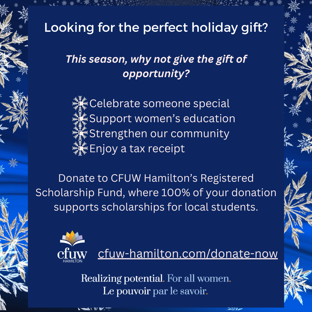 Your gift creates brighter futures! Donate to CFUW Hamilton’s Registered Scholarship Fund, where 100% of your donation supports scholarships for local students. https://cfuw-hamilton.com/donate-now/